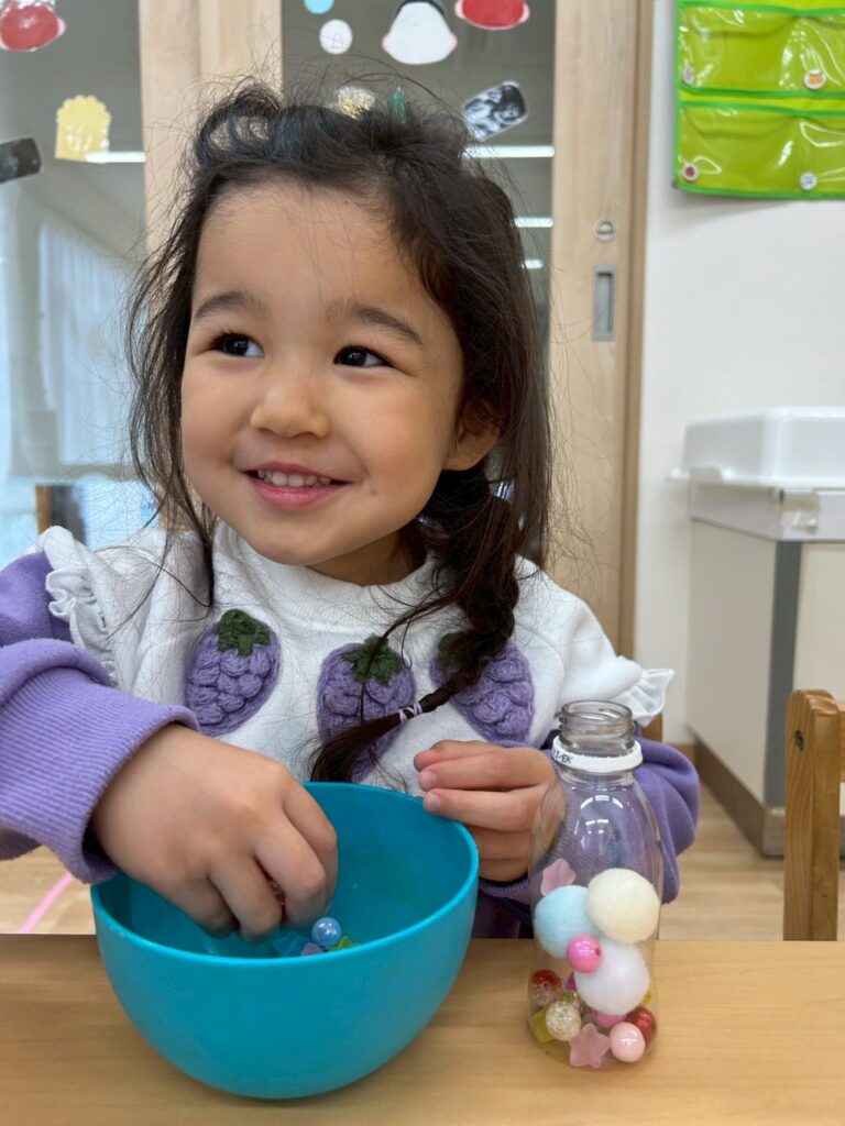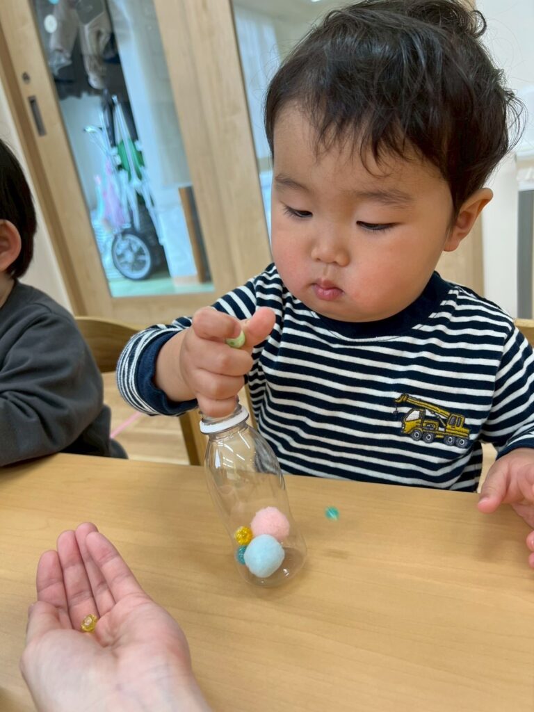 ペットボトルの中にビーズや可愛い石、鈴などを入れて振ると色々な音色を奏でます。中に入れる素材や入れ方もそれぞれみんな個性的でとても真剣でした♪