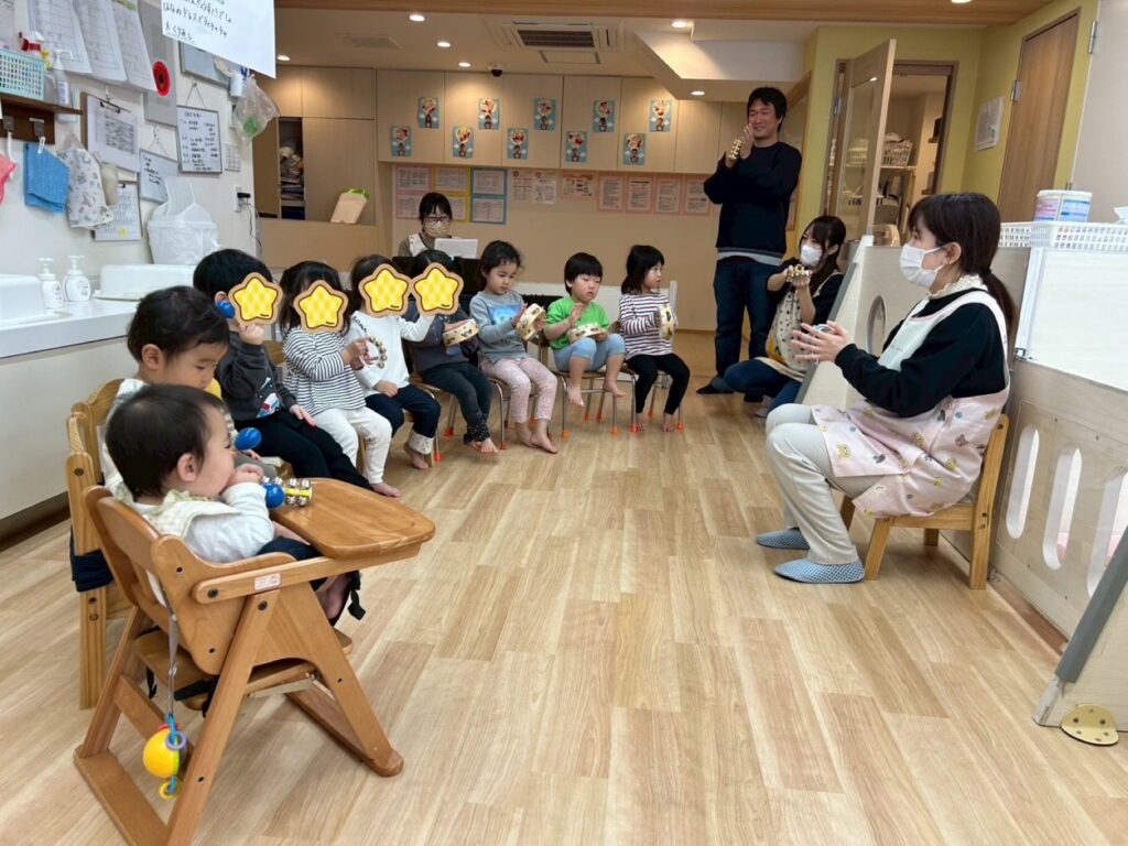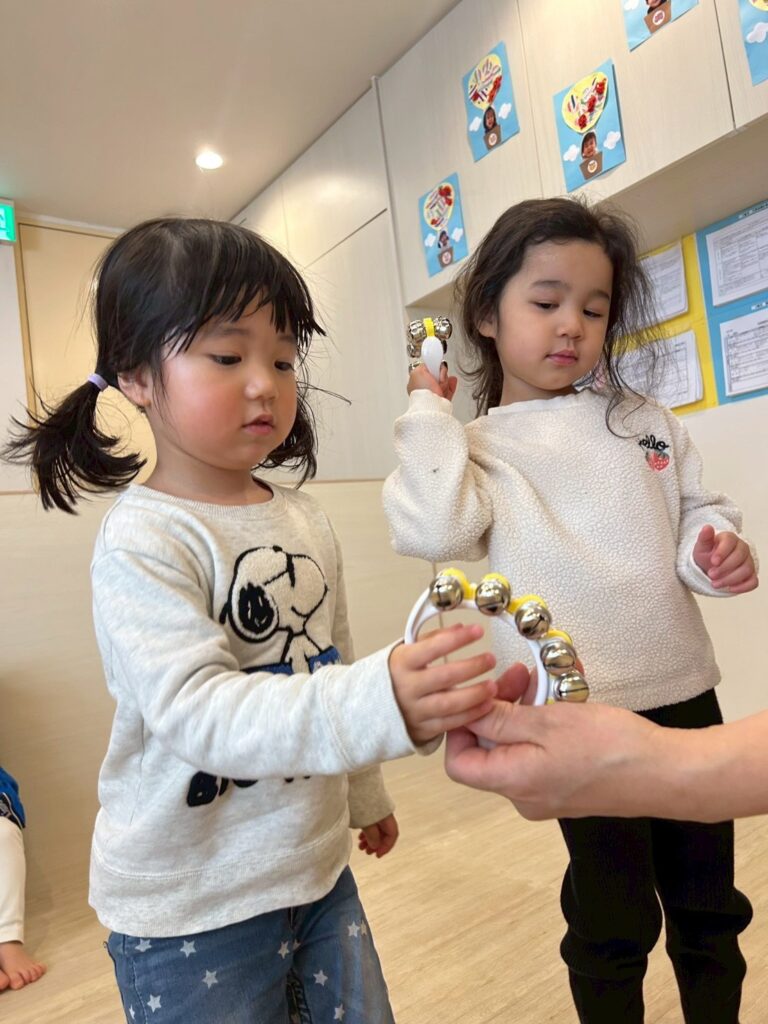園児の月齢によって使う楽器も分けましたが、リズム感良く上手にできていました♪
