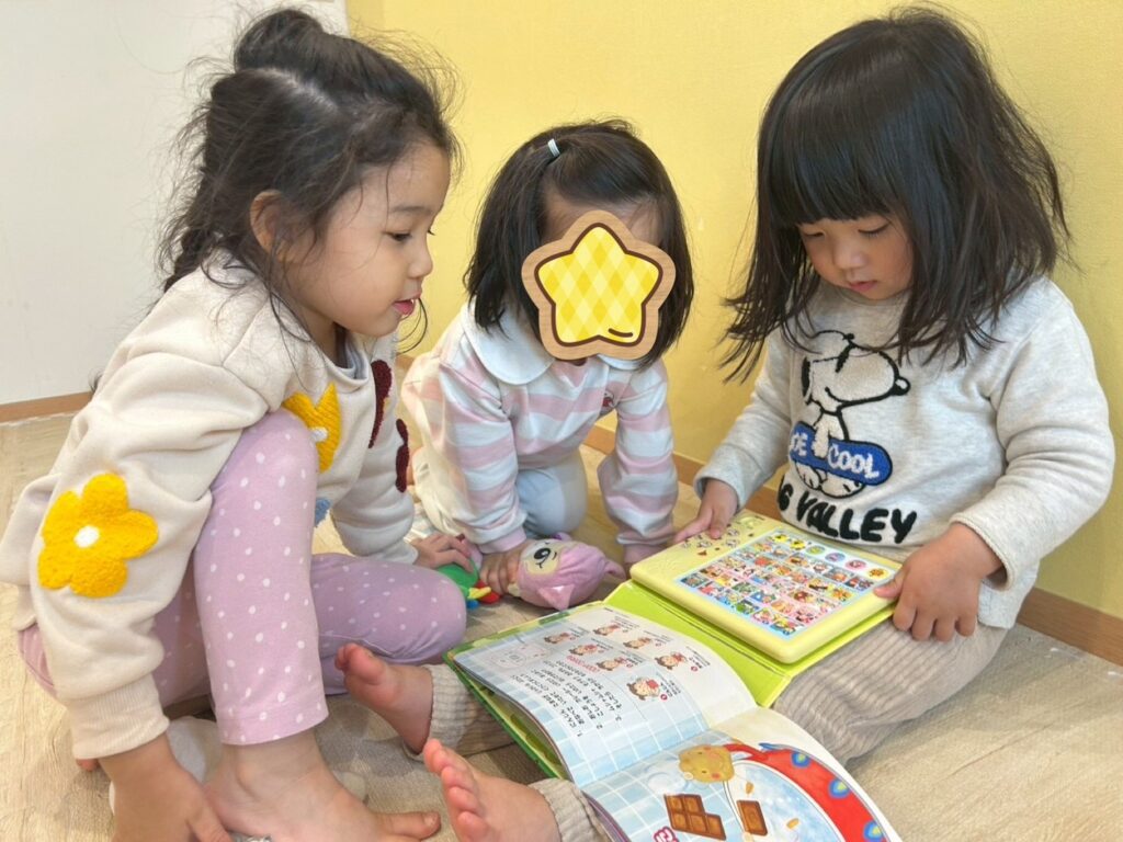 絵本は、はらぺこあおむしが人気で2歳児さんがお歌を歌いながら音に触れていました